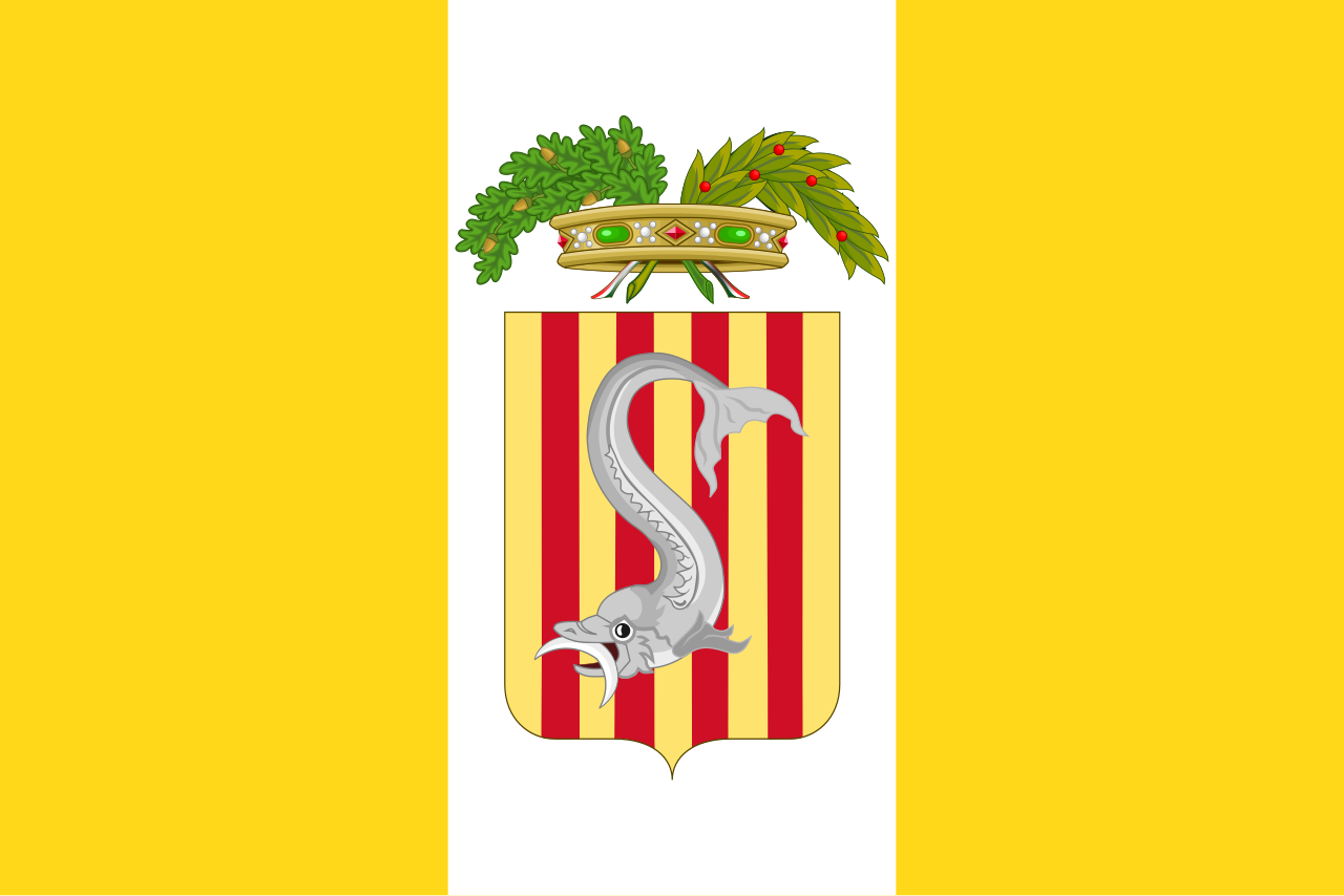 The coat of arms was approved by Decree of the Head of Government on November 30, 1933. It derives from the former coat of arms of the Terra d’Otranto, which in turn derived from the heraldic shield of the Aragona family, which ruled the territory during the XIV and XV century. According to a legend, the coat of arms, consisting of four red stripes on a golden background, is attributed to Goffredo il Villoso. The legend tells how Carlo il Calvo to reward Goffredo, who had fought heroically at his side, dipped in his blood four fingers and marked Goffredo’s shield. The coat of arms also features a dolphin with a crescent in the mouth. This latter element was added during the XV and XVI century when the Salento fought against the Turks.